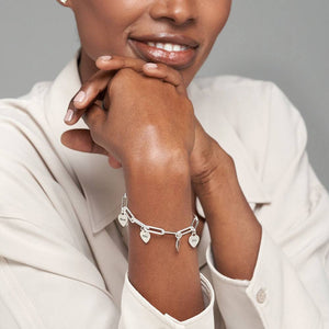 Gør dit Paperclip Charm Armbånd personligt med op til seks graverede hjertecharms på dette Sølvfarvede Armbånd med Indgravering. Dette Hjertecharm Paperclip Armbånd med sølvfinish er fremstillet i rustfrit stål med en vandafvisende overflade til daglig brug. Den moderne paperclip-kæde balancerer markant stil og komfort. Brug det alene eller sammen med andre armbånd for et personligt look.