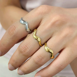 Minimalist yet full of character — the Wavy Ring Gold is your go-to piece for effortless style. Its fluid, wave-like design catches the light beautifully, adding a subtle golden glow to your look. Comfortable, versatile, and easy to pair with other pieces, this gold ring is a must-have for both casual days and special nights.