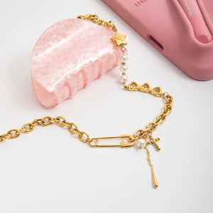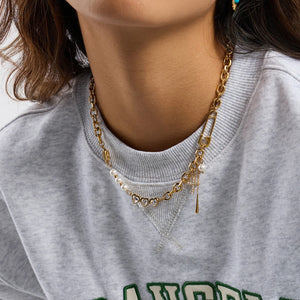 Add a bold twist to your look with this asymmetrical charm necklace. Featuring freshwater pearls, a gold star charm, sparkling heart-shaped stones, and dainty pendants including a cross, pearl, and gold bar — this necklace is designed to stand out. Layer it or wear it solo — either way, it’s a showstopper.