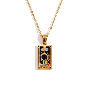 Step into your power with THE MAGICIAN© tarot pendant. Plated in 18K gold and set on a vivid black background with intricate details, this necklace is all about manifestation, confidence, and turning ideas into action. It’s bold, mystical, and perfect for anyone who’s into tarot or just loves meaningful jewelry. Wear it solo or stack it up with your favorite necklace, it’s your daily reminder that you’ve got everything you need to create magic.